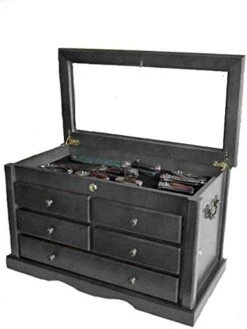 DisplayGifts Keychain Display Case Wall Mounted Solid Wood Cabinet Shadow Box With Hooks Black