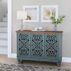Sophia & William Sideboard And Buffet With Storage, 3-Door Hollow-Carved Accent Cabinet, Distressed Wood Storage Cabinet Cupboard For Kitchen, Dining Room, Living Room, Entryway, Blue