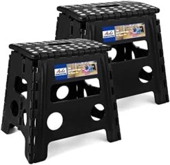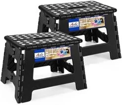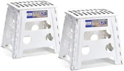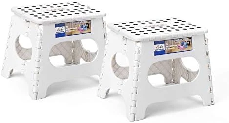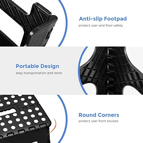 - ANTI SLIP – Special rubber dots on the surface and anti-slip black rubber strap on each foot for maximum foot grip and gives amazing comfort, preventing slippage. Unique, grip-dot textured surface makes the folding step stool safe for everyone. This safety features making the step stool great for multipurpose uses i.e. kitchen, bathroom, dining room, office, garden, camping, fishing and more.