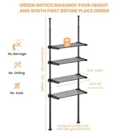 - [ASSEMBLY IS A BREEZE ] : No more making yourself dizzy among the numerous parts and screws, as installing this toilet rack is easy as 1-2-3 with easy-to-follow instruction with NO TOOLS, NO DRILLING required, you can start to enjoy your over toilet shelf organizer. Not work for slope ceiling