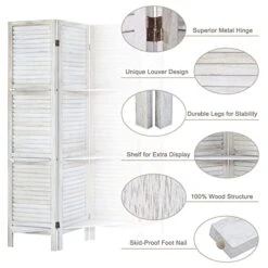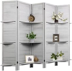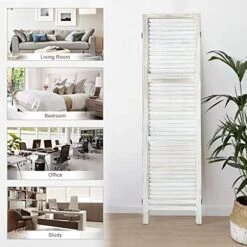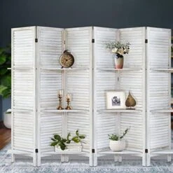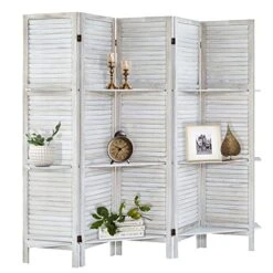 - Room Dividers with Shelves: The free-standing panel screen is built on solid wood, features a stylish louvered slat with 3 manufactured wood shelves to display your favorite decoratives while creating a smaller enclosed private space within a corner or along a wall.