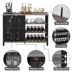 - 【Multi-functional Liquor Cabinet】This home bar cabinet features two mesh doors that open to reveal the stemware racks, as well as ample storage space. The wine racks on right side allows you to keep up to 15 bottles of your favorite vintages close at hand. The removable stemware rack and wine rack maximizes the function, which makes this liquor bar suitable to be used as coffee bar, home bar unit or buffet sideboard.