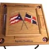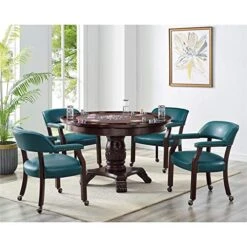 - Multi-Step Rich Cherry Finish with Teal Vinyl Upholstery
