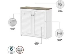- Two stylish louvered cabinet doors conceal household items, office supplies and more