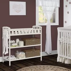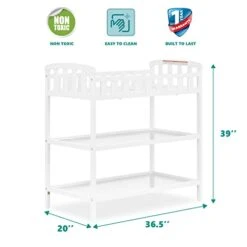 The Dream on Me Emily Changing Table allows any parent to change their baby with comfort and ease. Featuring a 1″ changing pad keeping baby happy and comfortable and 5 ½” safety rail that surrounds your baby with security so they don’t roll off the table . The open design featuring 2 shelves below keeps all your baby’s essentials close and convenient. With a great traditional design this crib fits perfectly into any decor.