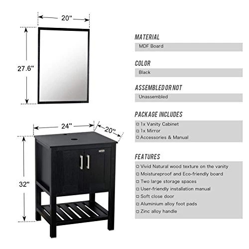 - DIMENSION: 24’’ L x 20’’ W x 32’’ H Black bathroom vanity; 20” W x 27.6” H mirror; 12”L x 20”W x 30” H Black side bathroom cabinet (3 Packages will be send).