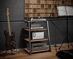 - 【Durable MDF & Stable Structure】This media stand is made of premium 15mm MDF board which has superior load-bearing to grantee long time using and also easy for cleaning and maintain. Sturdy power-coated steel frame come with adjustable foot pads also enhance the trapezoidal structure media shelf more stable, not only offers a large weight capacity (up to 110 lbs), but also waterproof and rust free.