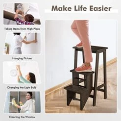 - 【Solid Rubber Wood Structure】: Made of premium rubber wood, the step stool is sturdy and durable for you and family to use for a long period of time, and can bear weight up to 200 lbs.