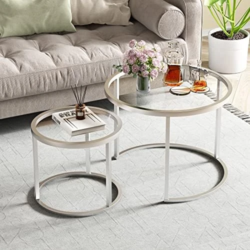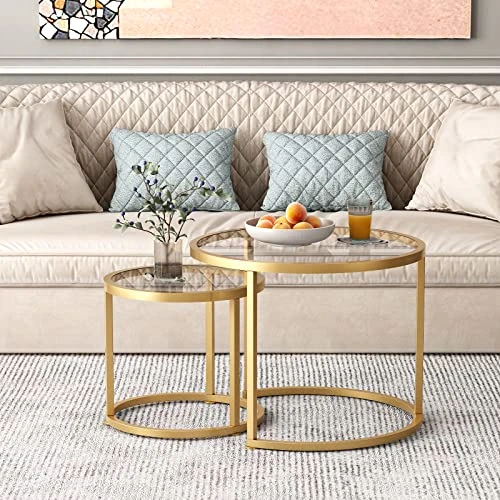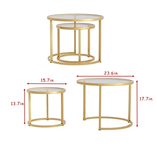 - 【Gold glass nested table】This round nesting coffee table features a high-quality tempered Blue Plated Glass top, good heat resistance,the legs are painted with high temperature, no odor, scratch-resistant, which is perfect for living room,bedroom,balcony and offices.