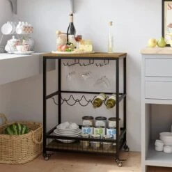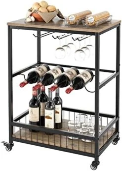 - [Flexible Design]: 4 caster wheels (2 with brake) enable the wine cart move around smoothly or stay still as you needs, while protective fences on the bottom shelf play an important role on preventing bottles and glasses from spilling