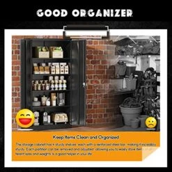 - γMultipurpose large cabinetγGreenvelly lockable garage organization cabinet with 2 locking doors and 4 adjustable shelves, can move the shelves up or down according to your need, each layer can bear 150 pounds, suitable for storing office documents and tools, as well as heavy items. Durable black metal cabinets are an ideal choice for home office, utility room, laundry, kitchen, garage, school, shop, warehouse, business etc.