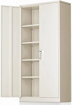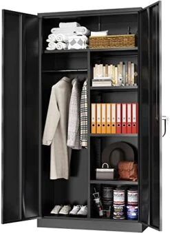 - 【Durable metal structure】: Greenvelly storage closet is made of solid cold-rolled steel. The garage cabinets and storage system’s high-quality powder coating means excellent anti-rust and waterproof properties. Improve service life. The office wardrobe has four removable partitions with a large capacity, each shelf can hold 180 pounds.