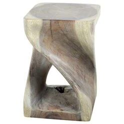Our Sustainable Monkey Pod Wood Twist Stool 10 inch x 10 inch x 16 inch high, Natural Food-safe Livos Agate Grey Oil Finish is hand carved from sustainable Monkey Pod Wood. The beauty of this design lies in its simplicity. It is bold, yet gentle, rustic yet refined. One quarter twists support this elegant piece, which can serve as an end table, display stand, or stool.