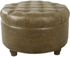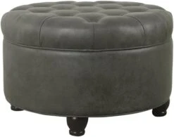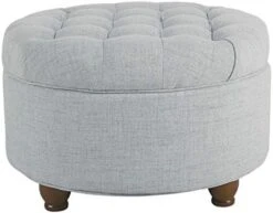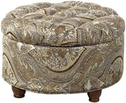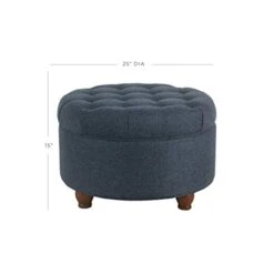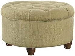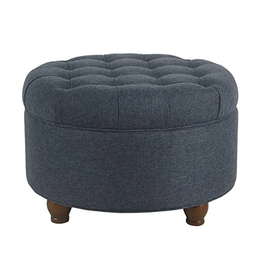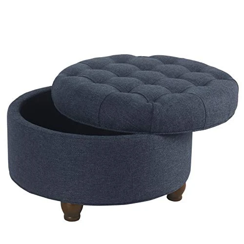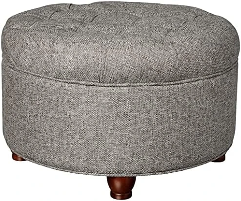 - STORAGE OTTOMAN: Created with premium soft and durable woven fabric our Round Ottoman with Storage offers a timeless style | Perfectly completed with tapered wood legs in a dark walnut finish along with button tufting on top