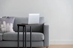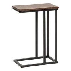 - C-shape of the wood and metal side table lets it slide easily over couch seats for easy reach