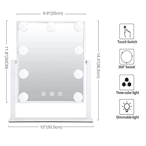 - 【 Portable, Compact & Elegangt Design 】 – Overall frame allows you to get your entire face in view at once. The 9 frosted LED globe bulbs can be used continuously with 50,000 hours life span. It is very durable without changing the bulb.Fitted the rubber pads on the bottom to prevent the mirror from slipping or falling during use.