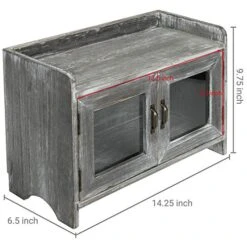- Approximate Dimensions: Overall – 9.75 H x 14.25 W x 6.75 D; Top Shelf – 1.25 H x 13.5 W x 6.0 D; Each Door – 6.5 W x 6.5 H; Glass Windows – 4.25 W x 4.25 H (in inches)