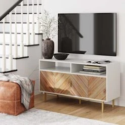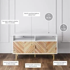 - Product 1: Rustic yet modern, the accent media cabinet with beautiful herringbone solid wood doors design will add style and character to any room. Use it as an entryway table, in your dining room as a buffet or in your office as storage cabinet.