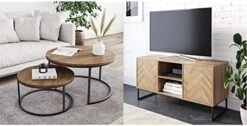 - This nesting cocktail table’s reclaimed oak wood finish and sturdy metal base will complement any living room décor.