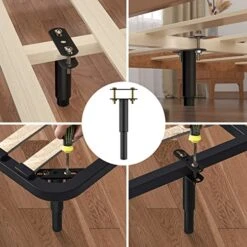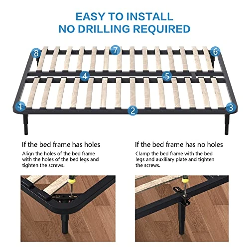 - EASY INSTALLATION: Installation steps: (1)Prepare screwdrivers and wrench. (2) â‘ Bed frame has holes, fix the positions and holes to be installed; â‘¡ Bed frame has no holes, use the feet and the bed frame to place it in a crisscross style, place the plate on the corresponding bracket on the bed frame, clamp the bed frame. (3)Align the screws with the holes and tighten them. (4)Adjust the height by manually rotating the bed support legs. T- shaped feet, no punching, easy to install.
