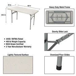 - Easy Storage: Legs fold neatly under the table for easy storage. The table has a built in carry handle for easy manuvering.
