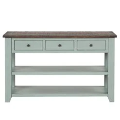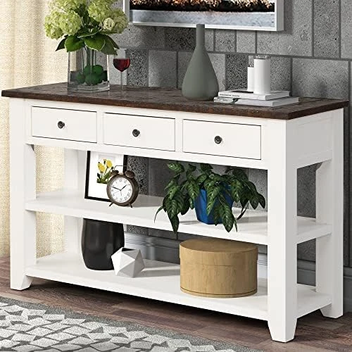 - β€ LARGE STORAGE SPACE: Our console table can satisfy your different storage needs. The sideboard comes with three big drawers, so you can put your files, glasses and other daily necessities to reduce clutter. Meanwhile, there are two shelves underneath the drawers which can be used to placed books, baskets and plants, while the table top can hold photos, table lamp and more.