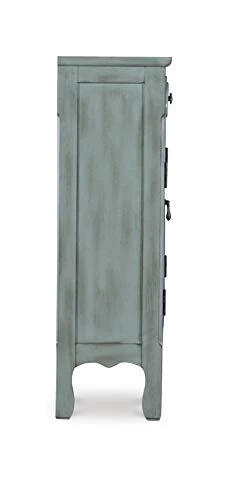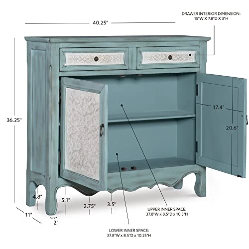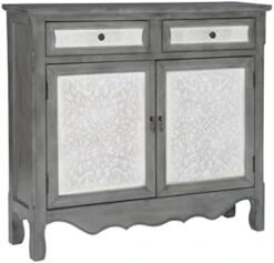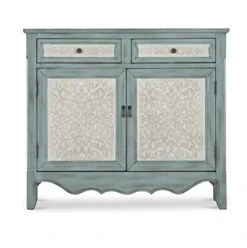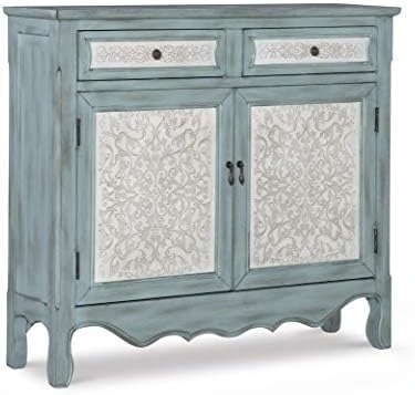 - A raised decorative pattern adorn the front, with an antique brass finished hardware.