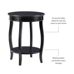 This contemporary round table is a convenient accent for any room of your home. Pair this piece with your favorite accent chair, on either side of your sofa or even as a nightstand beside of your bed. A round lower shelf offers a convenient option for storing magazines, coasters or your favorite books. The cabriole tapered legs can match almost any style or design. Some assembly required.