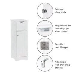 - Cabinet door with mirrored doorknob conceals one adjustable and one fixed bottom shelf for stowing away extra toilet paper, wash cloths, bath soaps and more.