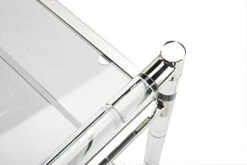 - This bar cart features a clear finish with silver accents and clear glass shelves