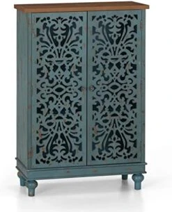 - 【Beautiful and Functional】Hollow-carved wood crafted detailing and shabby chic distressed style make it eye-catching and distinctive in any space, combining an antique, weathered look with a rustic, industrial feel. Simple style and classic color make it a good match with any other furniture in your house while also being pleasantly practical to meet your various storage needs