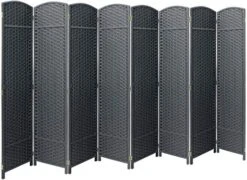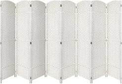 - DECORATIVE DESIGN — Stylish woven pattern — Made of poplar wood frame with PP woven straps — Double-hinged for versatility and folding — Protect from outdoor elements — Each panel approx. 19.50” wide — Overall unit measures approximately 130” L x 19.50” W x 69” H