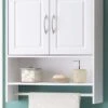 - AMPLE STORAGE: This over toilet bathroom organizer features a storage cabinet with doors for storing toiletries out of sight and an additional open shelf at the bottom for easy access or display. The adjustable shelf inside the cabinet can accommodate items of different sizes.