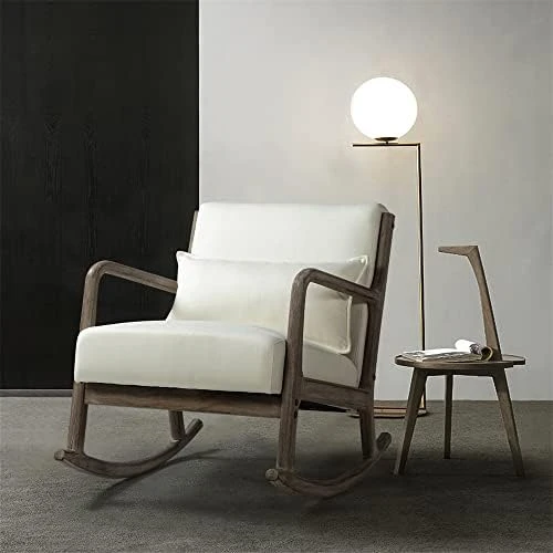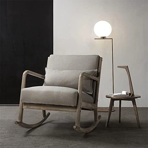 - [Rocking Style]: The mid-century rocking chair invites you to ease into a whimsical balance of sleek simplicity and vintage chic with its nifty dimensions and charming rocking chair design. Crafted with solid and manufactured wood, plus a natural wood-grain finish with subtly textured feel and mid-century modern appearance for simple yet fashionable charm in any living room. A lumbar pillow on the back adds an extra dash of distinction to this eye-catching design.