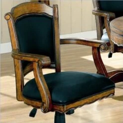 Coaster Turk Arm Chair with Casters in Tobacco (included quantity: 4) The height of elegance brings romantic character. Dress up an entertainment space with this beautiful game chair. Incredible attention to detail covers all bases with romantic curved accents and scalloped edges. With a tobacco finish and black leatherette seat cover, it extends a versatile and enticing look. Caster wheels aid in movement for game night.