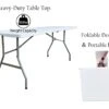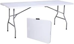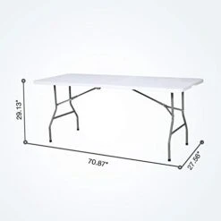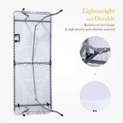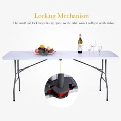 - DURABLE CONSTRUCTION: Reinforced steel frame & high-density polyethylene material provide this table superior strength and durability. Locking mechanism helps the table stay open while using. PORTABLE DESIGH: Unique folding design with a handle for convenient transport and storage, quick assembly & no tools needed.