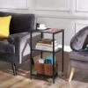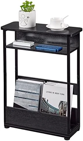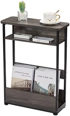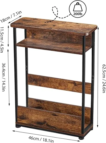 - 【SPACE SAVING】This side table with storage measures 18.1″(L)*7.1″(W)*24.6″(H), with smart and narrow construction of 7.1-inch width, this industrial accent table is perfect for small spaces as a sofa end table,nightstand put in the corner and small spaces, the side table not very spacious but still has enough space to add a lamp, drink and magazines or books in the top panel; You can put phone remote control and other mess in a neat and the lower storage, and you can put books papers or magazines in the wooden rack featured bottom.