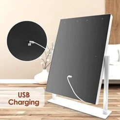 - [Large Size & USB charge port]: A perfect size(14.37”x 18.90”), which is providing a large and bright viewing to help you achieve flawless professional makeup. Anti-slip base keeps the mirror to stay on your dressing desk. The USB charge port at the bottom allows for charging adapter, power bank, or laptop(the mirror itself cannot store power).