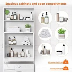 - 【Enough storage space】: This over the toilet rack features two open shelves for quick access to daily necessities, an enclosed cabinet for extra toilet paper, private stuff, helping to create a tidy, neat as well as spacious bathroom.