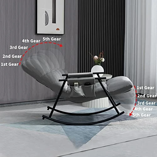- 📌【Multipurpose Design】This baby rocking chair nursery with 5 gear adjustable back and footrest, so you can adjust the angle you need, play with your phone, read a book while sitting down, or lie down on this recliner chair for a nap. There are non-slip foot pads under the base, Anti-tilt design, and extra tripod between two legs making it 15-degree rock gently and smoothly. What’s more, there is a pocket on the side of the armrest, which is convenient for storing magazines, phones and other necessary items.